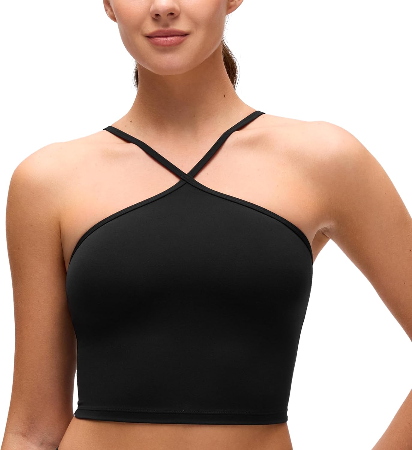 CRZ YOGA Butterluxe Cross Neck Crop Tank Tops for Women - Spaghetti Straps Square Back Padded Yoga Sports Bras