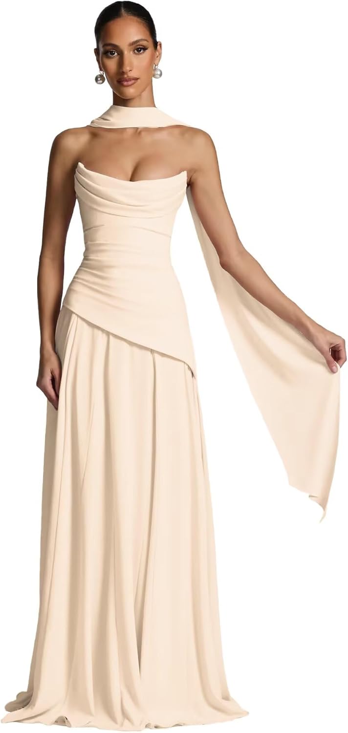 Strapless Cowl Neck Chiffon Bridesmaid Dresses for Women Corset Long Prom Dresses 2026 Ruched Maxi Dress with Scarf