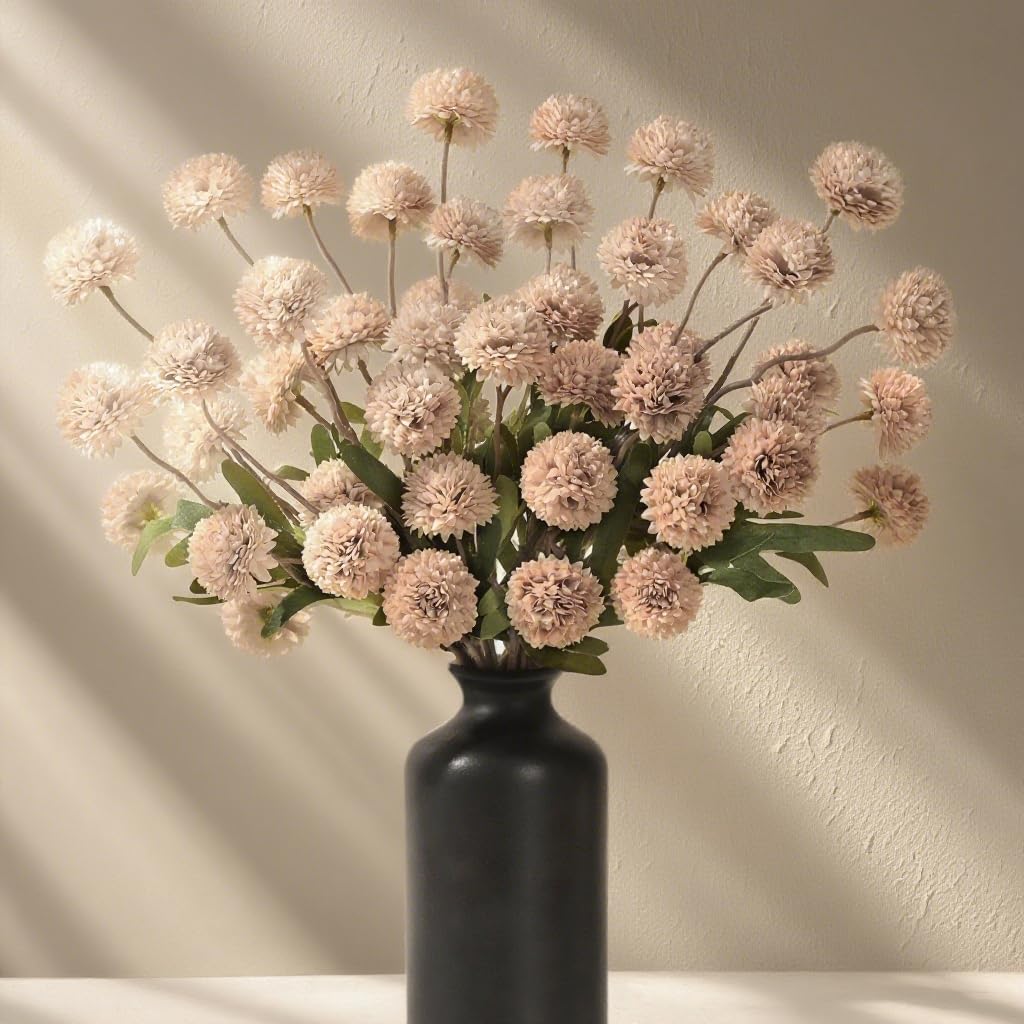 - Get Valued Artificial Flowers: Look, our chrysanthemum bunch, designed with a modern aesthetic. Each stem is a perfect mix of long, leafy greens and vibrant Pompon Mums. You've got 5 fluffy balls on every stem, with a total of 6 stems, that's 30 fake pompon mums creating a full, lush bouquet. Each one stands tall at 21", just bend them or trim them down to fit whatever look you're going for.