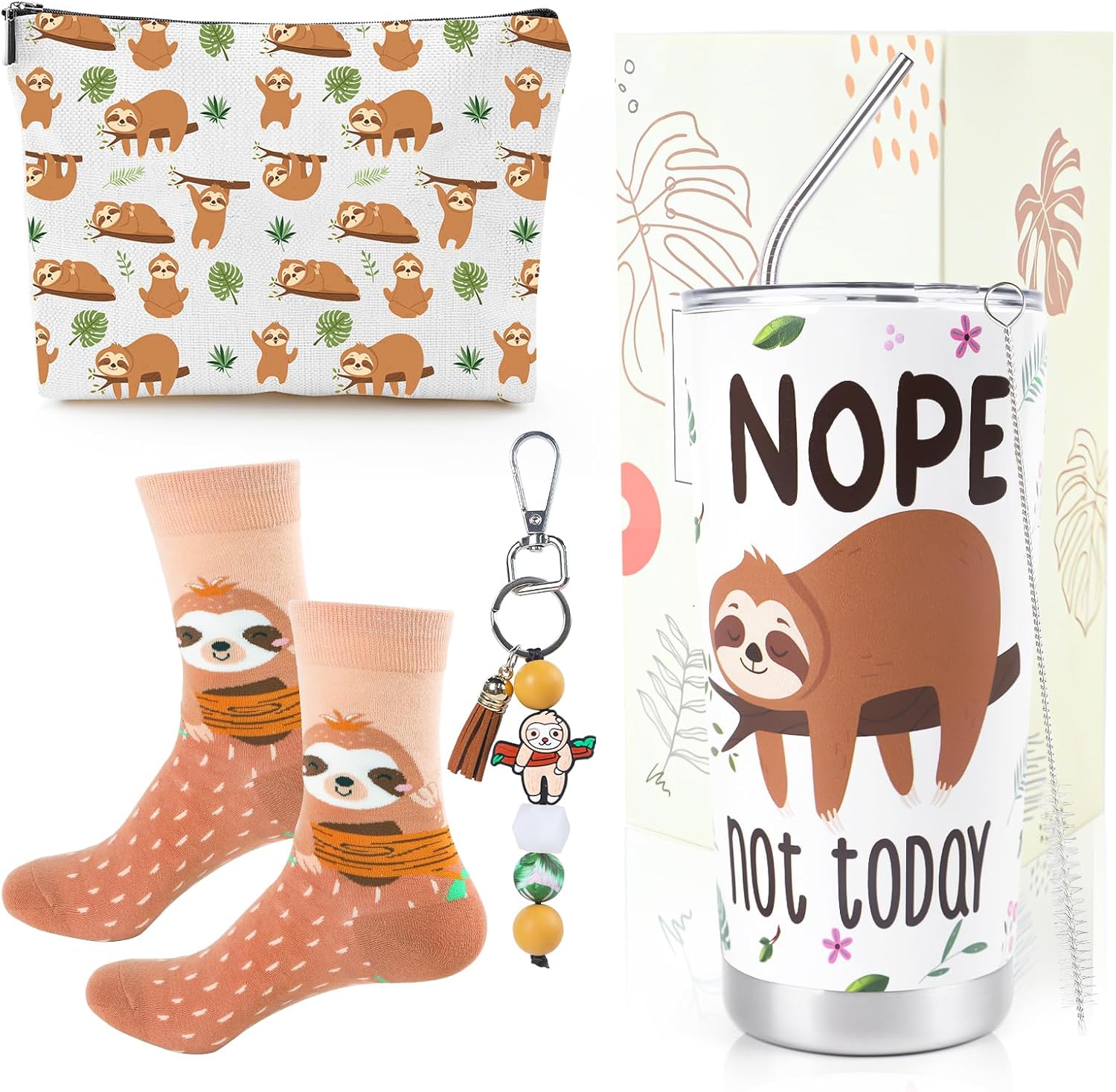 - Sloth Gifts for Women: This 4pcs sloth gifts set is a unique combination, including a 20oz stainless steel sloth tumbler, cute sloth makeup bags, cozy sloth socks, and a funny sloth keychain.The sloth gifts set is a specially designed for sloth lovers women girls. With cute design and practical items, this sloth gift set is sure to bring smiles to anyone who receives it