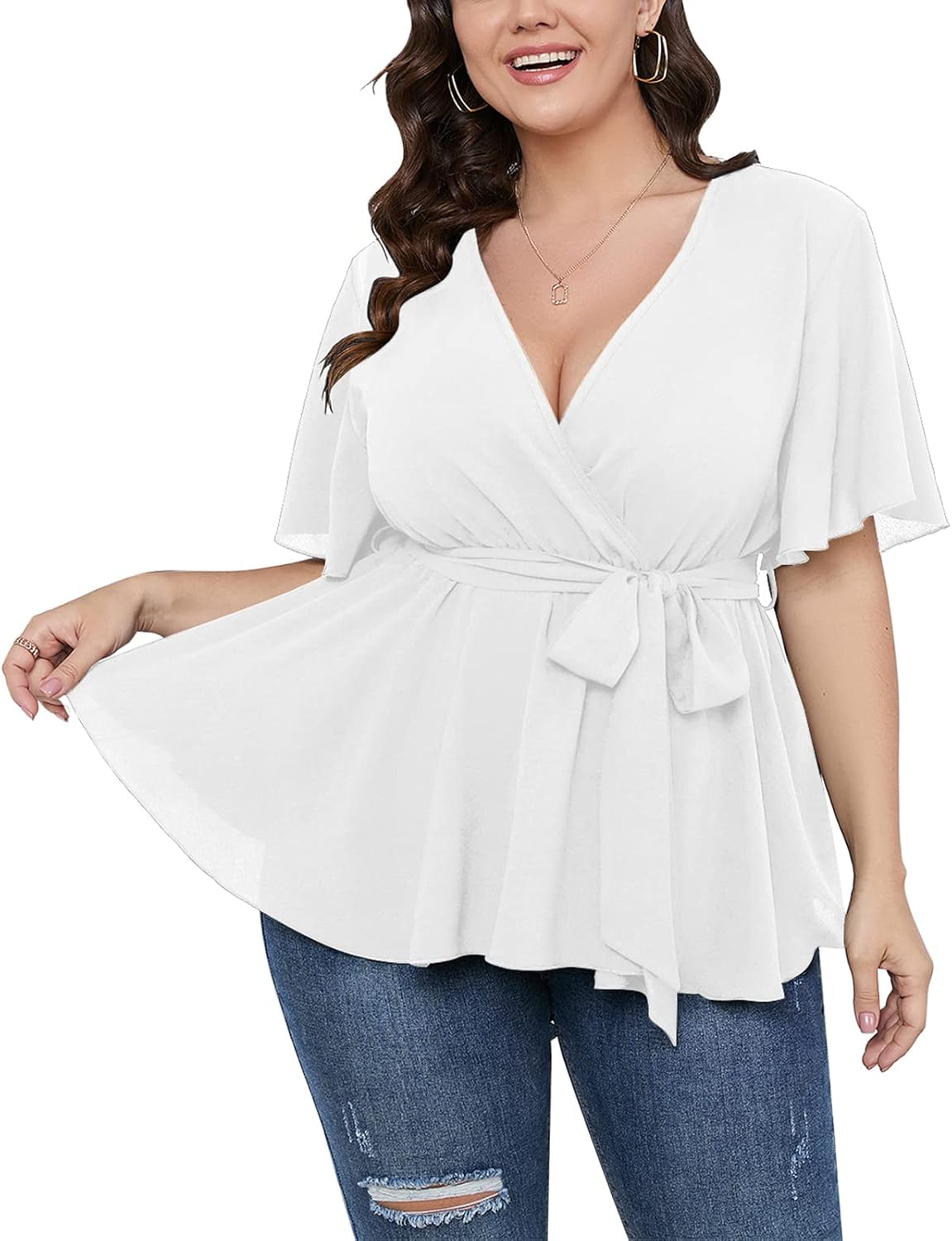 SCOMCHIC Women's Plus Size Short Sleeve V Neck Wrap Belted Ruffle Peplum Blouse Tops