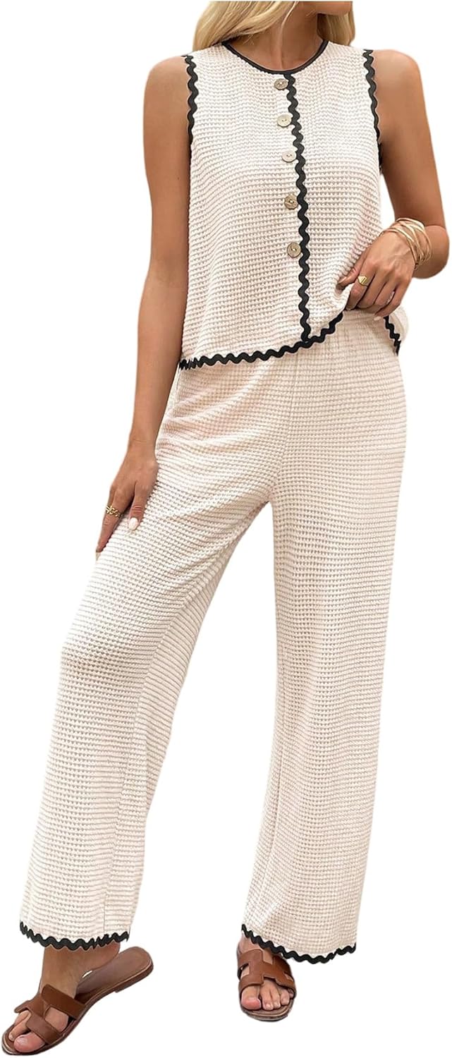 SweatyRocks Women's 2 Piece Summer Travel Outfits Button Down Waffle Knit Tank Top and Pants Sets
