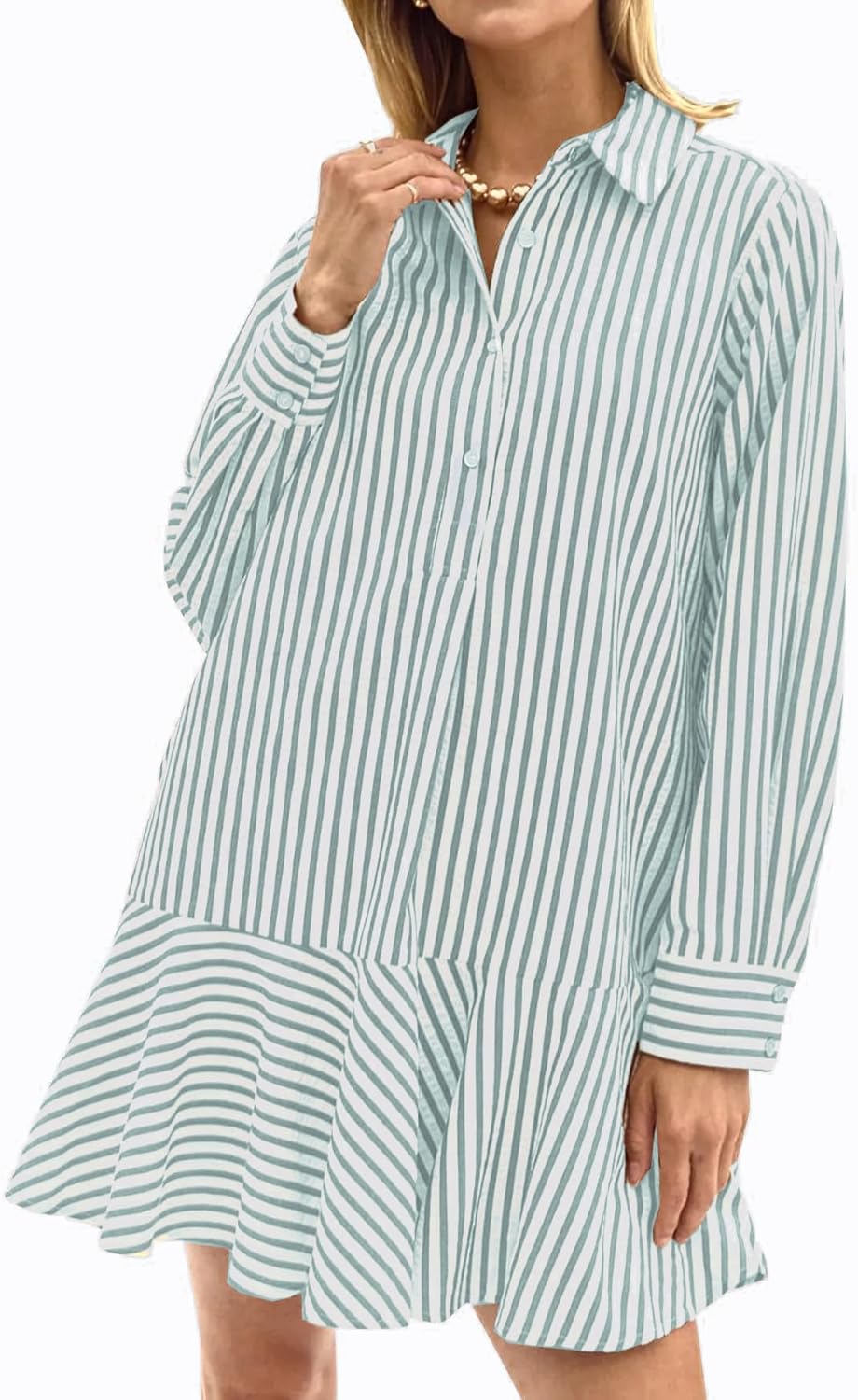 Womens Striped Shirt Mini Dress Long Sleeve Collared Button Up Flowy Ruffle Hem Swing Shift Tunic Dress