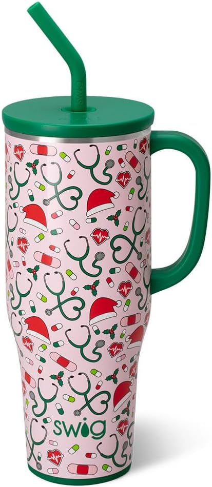 Swig Life 40oz Mega Mug, 40oz Tumbler with Handle and Straw, Extra Large Insulated Tumblers, Cup Holder Friendly Travel Mug (Santa's Scrubs)