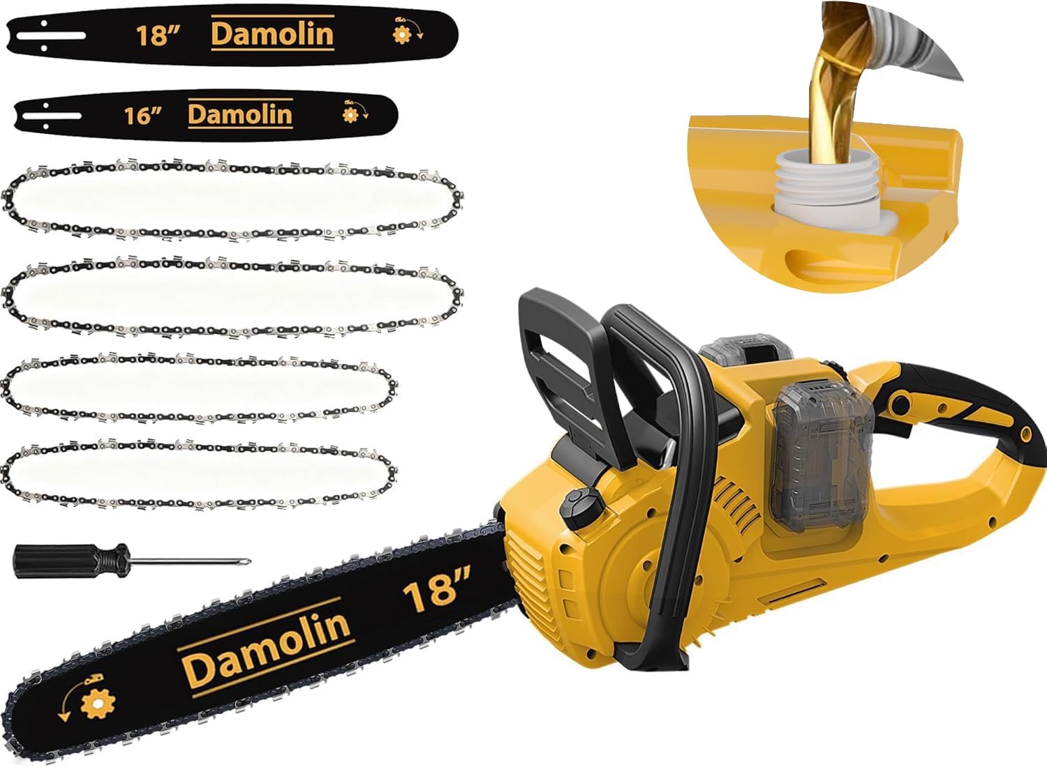 - 【Tool-free Chain Tensioner】DAMOLIN cordless chainsaw compatible Dewalt features a tool-free design for easy chain installation and replacement. It has a rotary switch allows for quick, on-the-fly chain tension adjustments without any tools, ensuring optimal cutting performance and safety.(Note: For best results, check and adjust the chain tension after using the chainsaw for a while.)