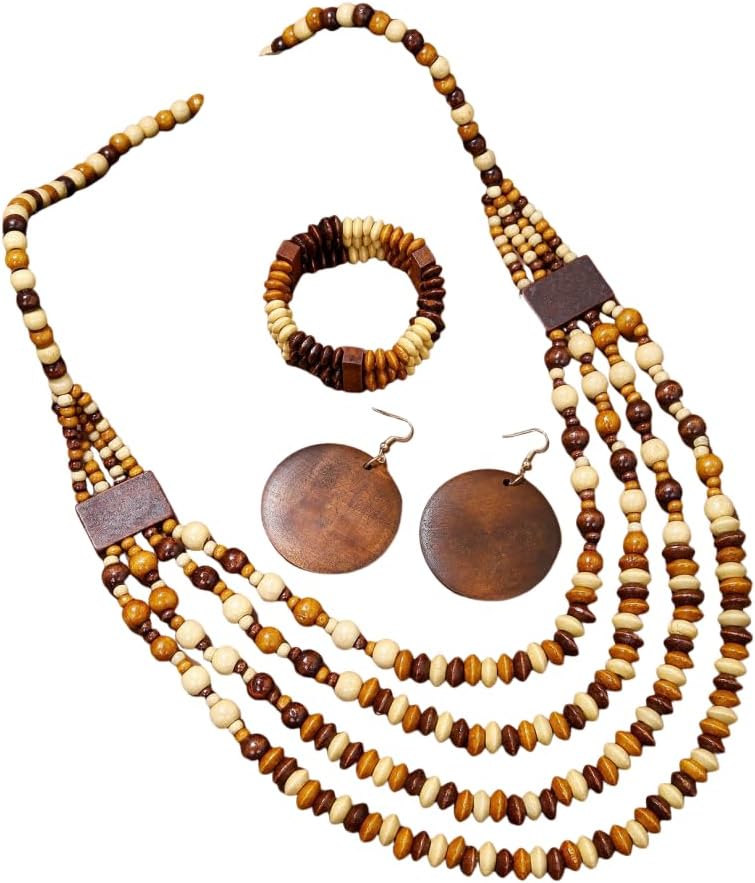 DATOA Vintage Colorful Wood Beaded Choker Necklace Bracelet Set Bohemian Geometric Dangle Earrings Ethnic Style Costume Jewelry for Women