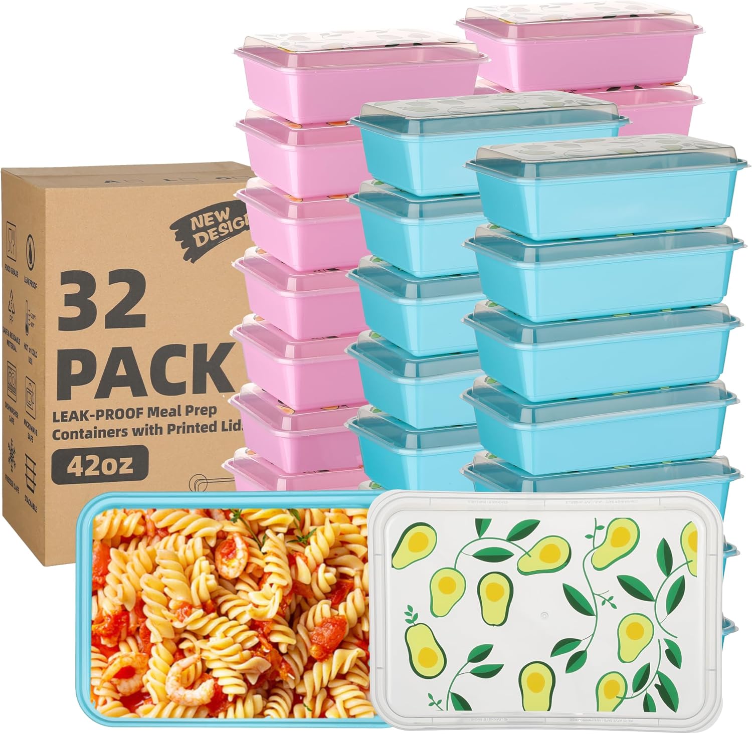 32 Pack 42 oz Meal Prep Containers, Reusable Plastic Food Prep Storage Containers with Printed Lids, Stackable, Leakproof, Microwave & Freezer & Dishwasher Safe,To Go Take Out Box, Avocado