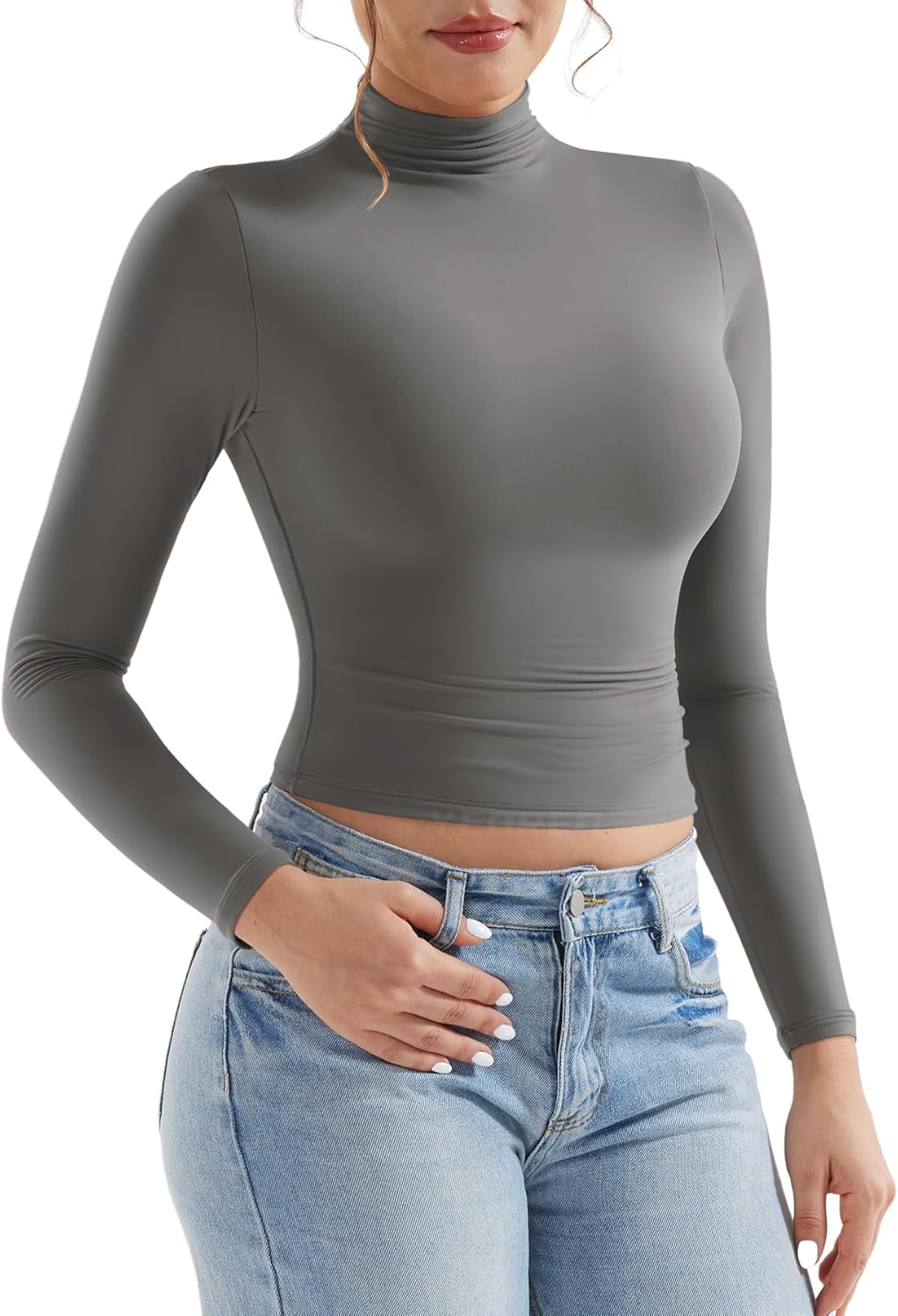 YEOREO Long Sleeve Workout Crop Mock Thermal Turtle Neck Double Lined Base Tops Shirts Women Sariah Y2k Undershirt