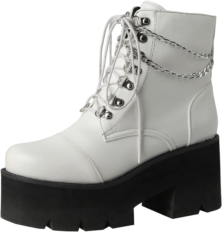 LUXMAX Women Buckle Goth Chunky Platform Ankle Boots Lace Up High Heel Motorcycle Boots with Chain