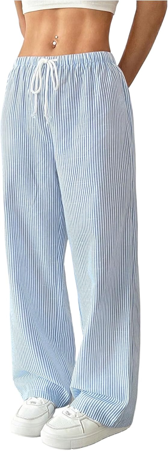 Milumia Women's Striped Wide Leg Low Rise Linen Pants Drawstring Elastic Waist Long Trousers with Pockets