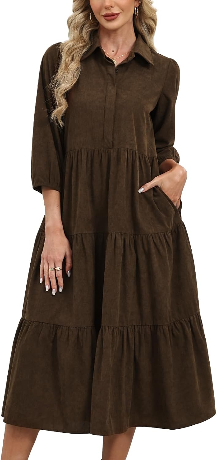 Women’s Corduroy Maxi Shirt Dress Button Up 3/4 Sleeve Flowy Tiered Ruffle Hem Casual Spring Long Dress with Pockets