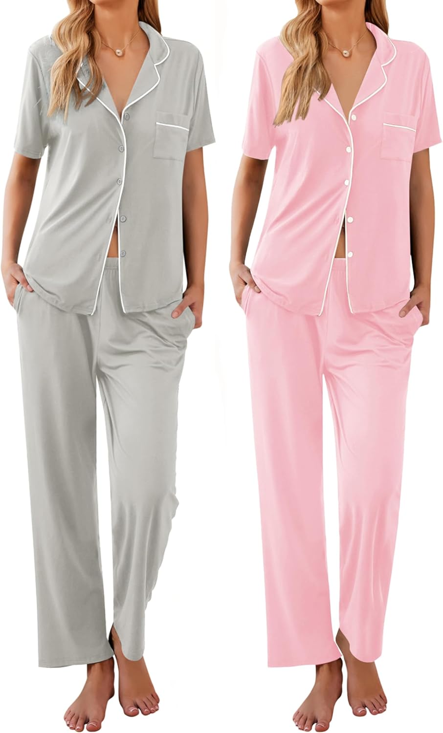 Ekouaer 2 Pack:Womens Pajamas Short Sleeve Pjs Notch Collar Button Up Loungewear Cozy Sleepwear Sets