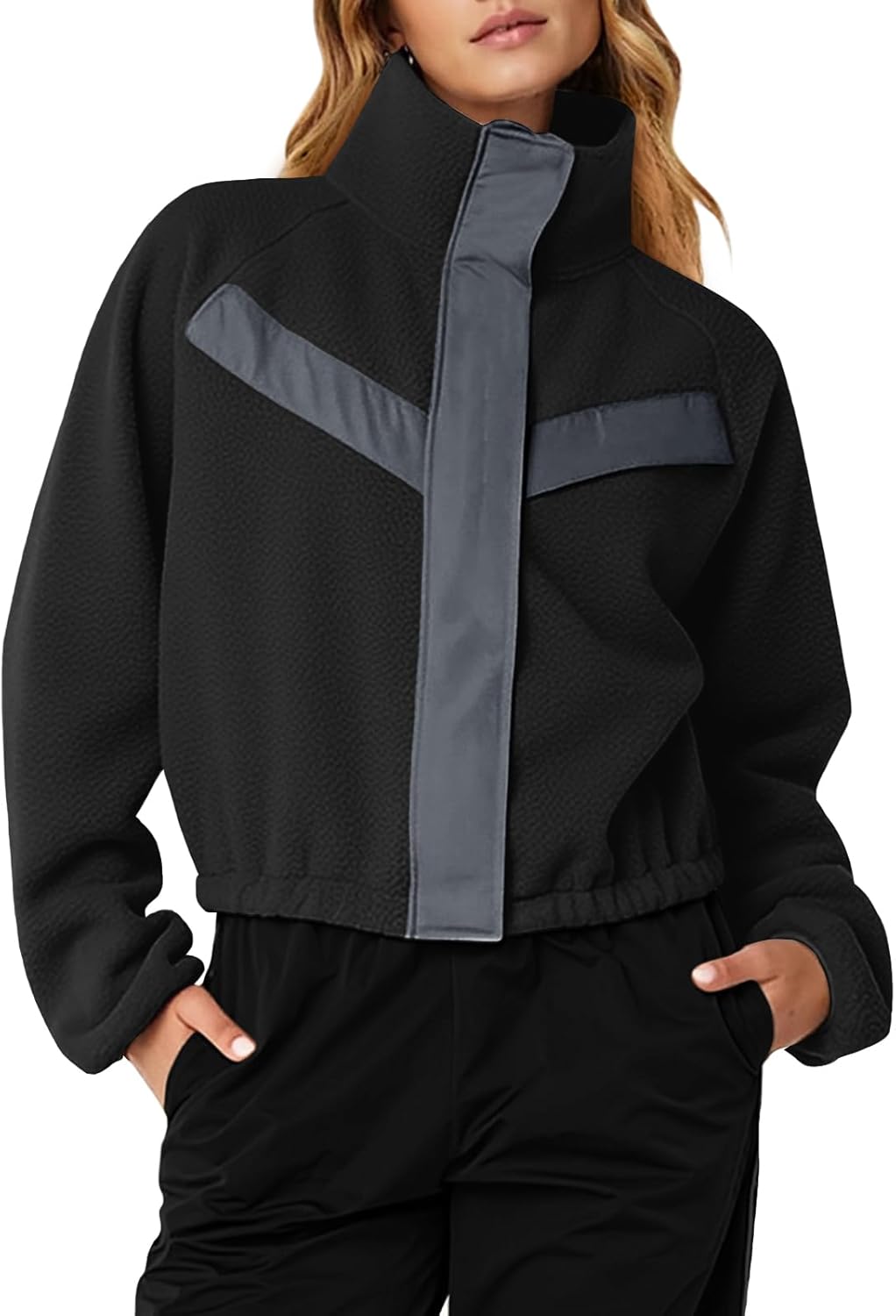Fisoew Womens Fuzzy Fleece Cropped Jackets 2025 Fall Long Sleeve Zip Up Stand Collar Sherpa Jacket Winter Coats with Pockets