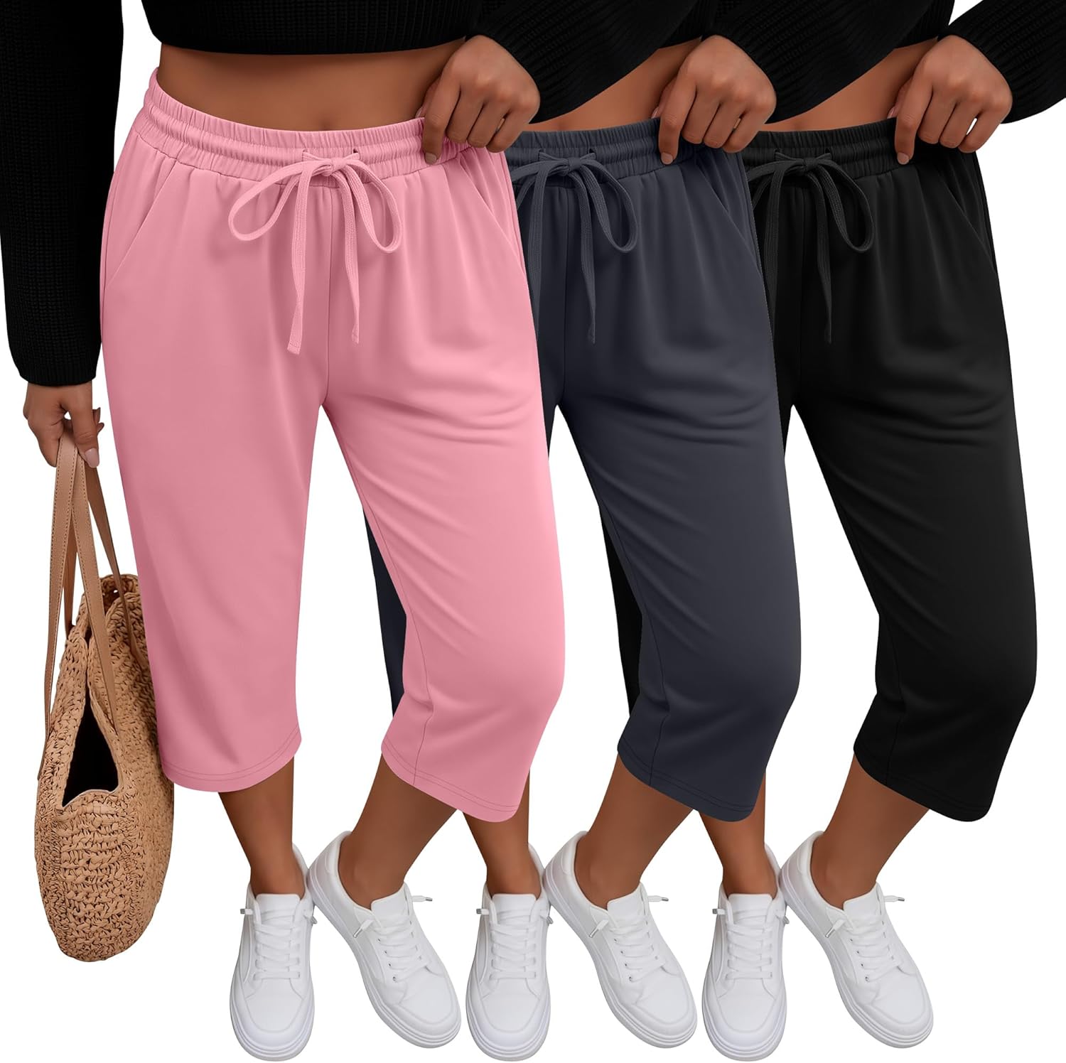 Huukeay 3 Pack Women's Capri Pants, Drawstring Lounge Capris Wide Leg Cropped Pants with Pockets Workout Yoga Joggers
