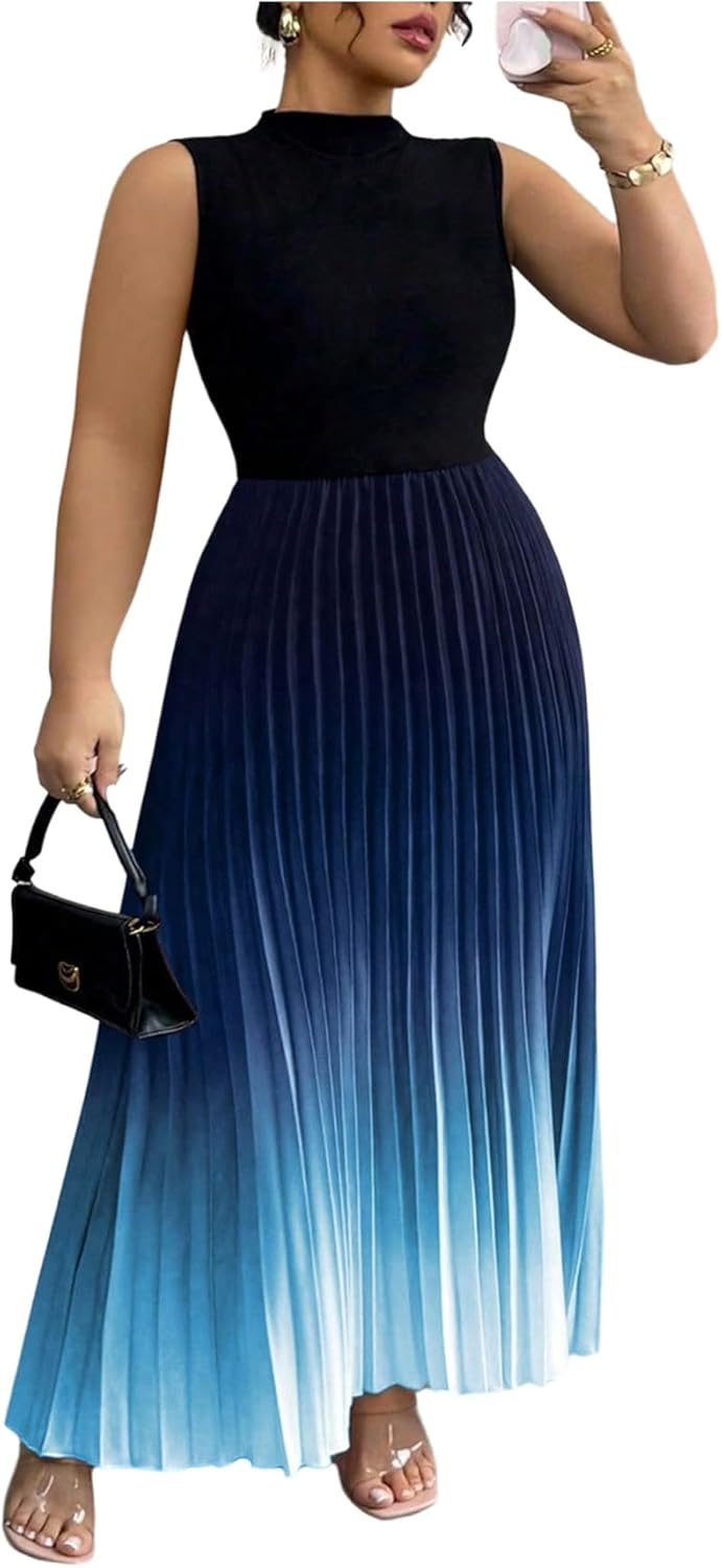 SOLY HUX Women's Plus Size Maxi Dress Ombre Mock Neck Sleeveless Pleated A Line Flowy Long Dresses