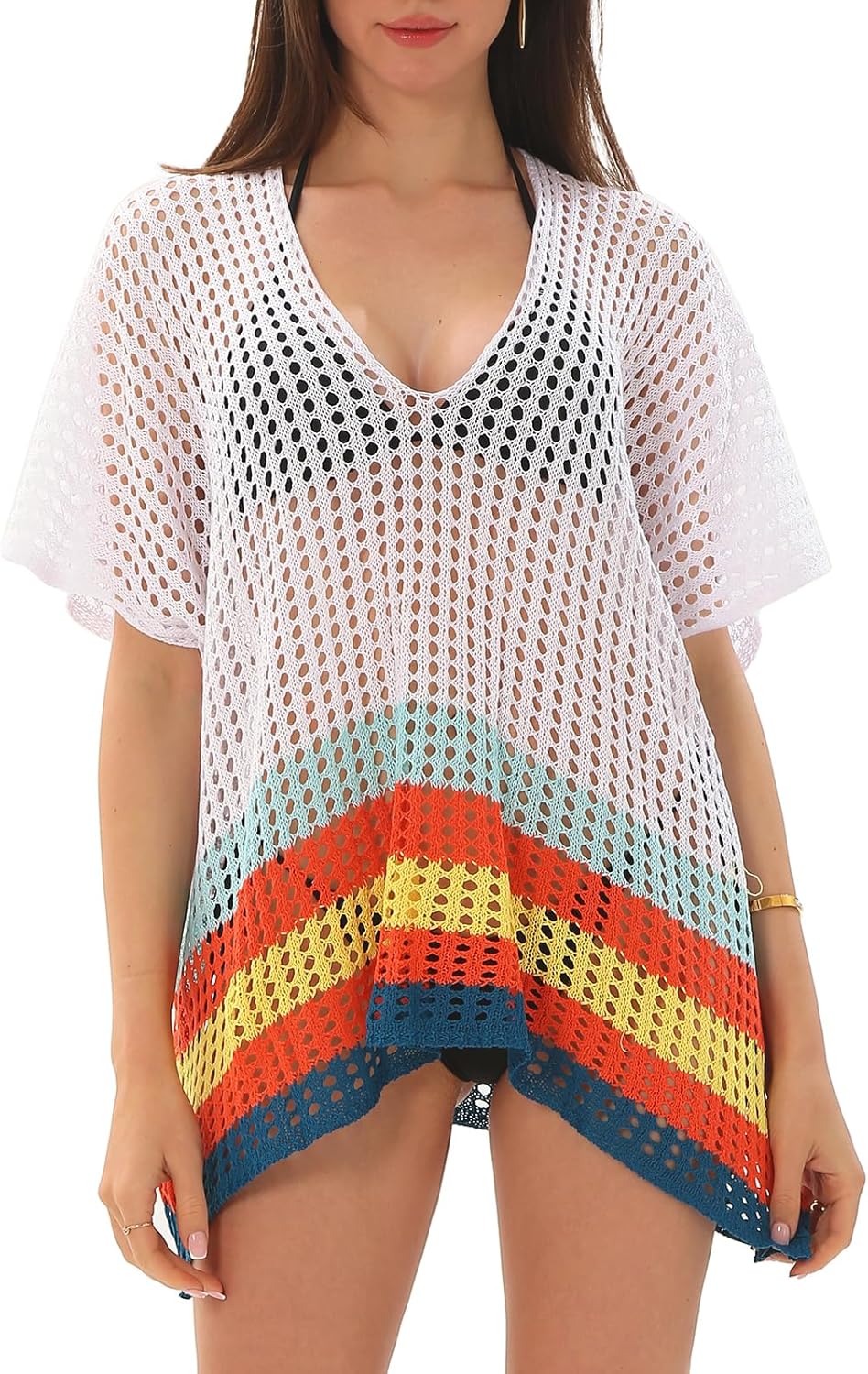 Women Swimsuit Crochet Swim Cover Up Beach Bathing Suit Swimwear Mesh Knit Short Sleeve Beach Dress Vacation