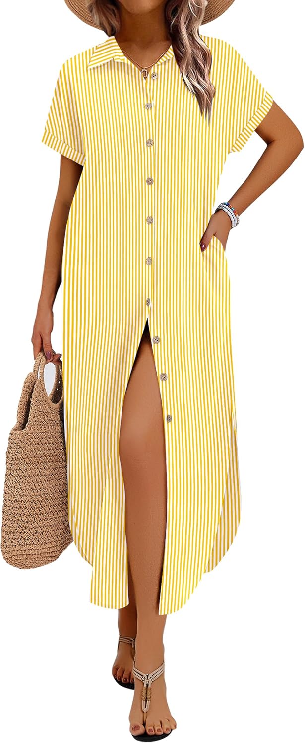 Zeagoo Womens Summer Casual Short Sleeve Button Down Long Shirt Dresses Loose Swimsuit Beach Cover Ups with Pockets