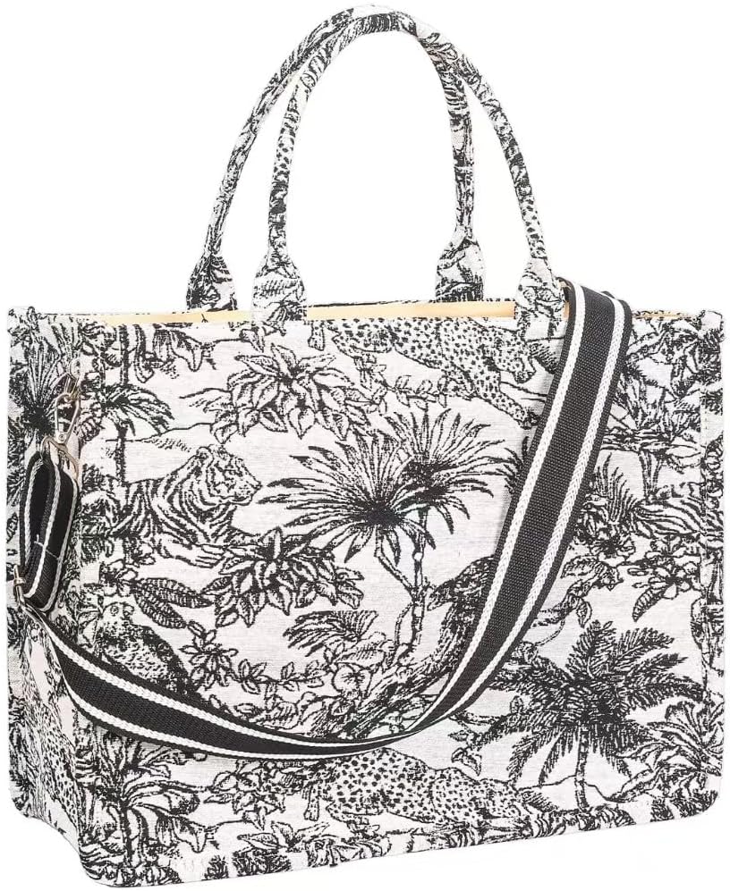 Large Tote Bag for Women with Strap, Linen Jacquard Handbag, Retro Tiger Leopard Embroidered Purse | Detachable Strap, Retro Embroidered, Versatile