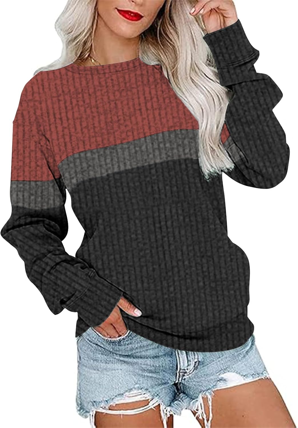 Women's Casual Long Sleeve Color Block Tops Crewneck Sweatshirt Pink Gray M