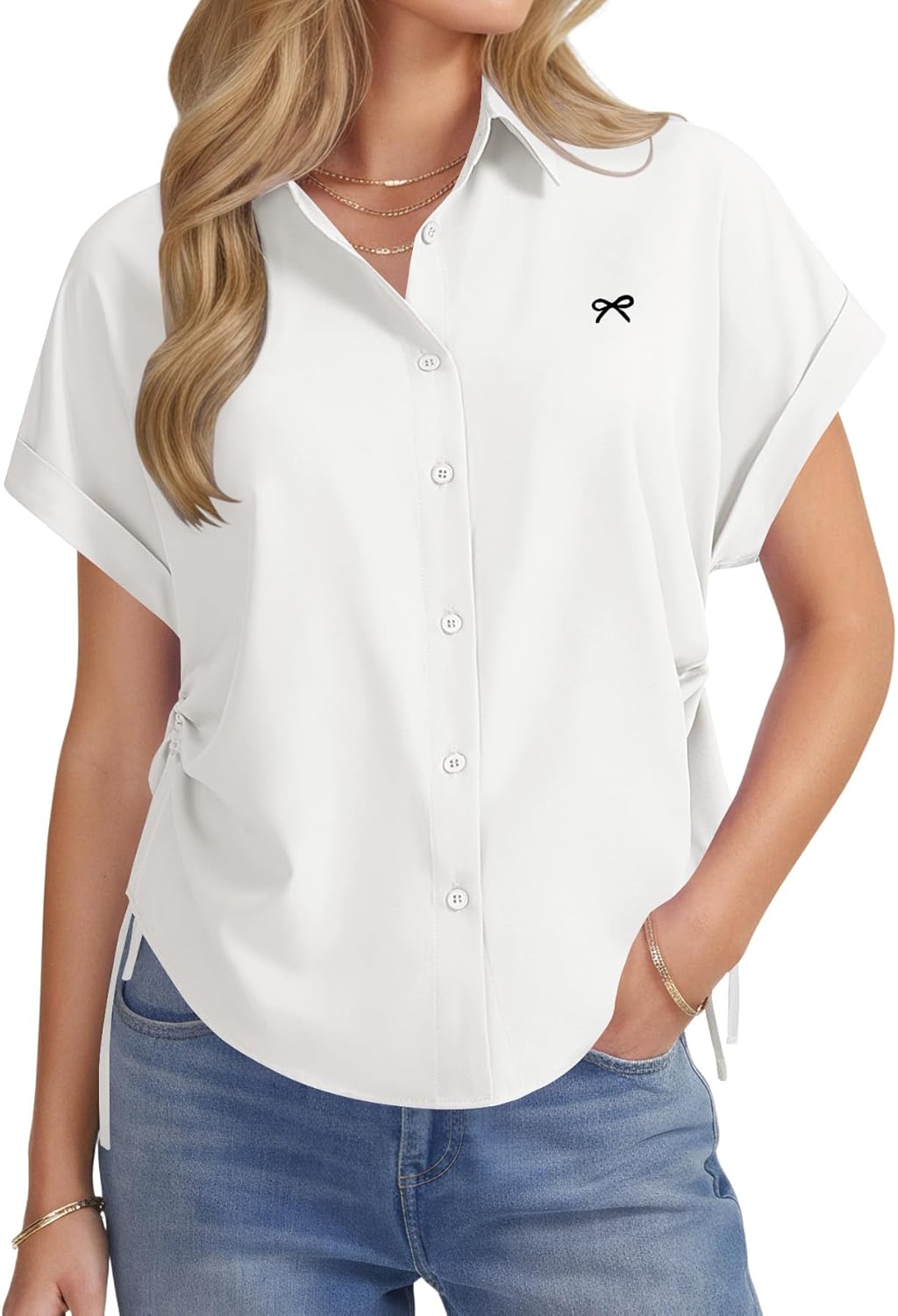 LYANER Women's Short Sleeve Button Down Collared Drawstring Side Dressy Casual Shirt