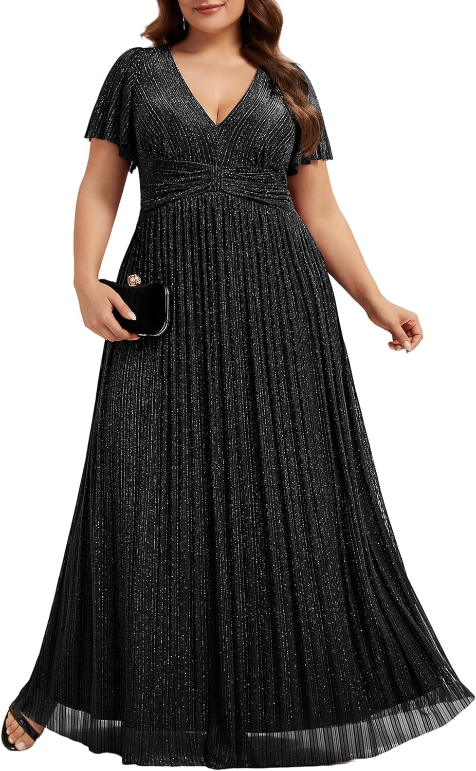 Ever-Pretty Women's Plus Size Glitter A-Line Formal Dresses V-Neck Short Sleeve Evening Gown Long Mother of Bride Dress