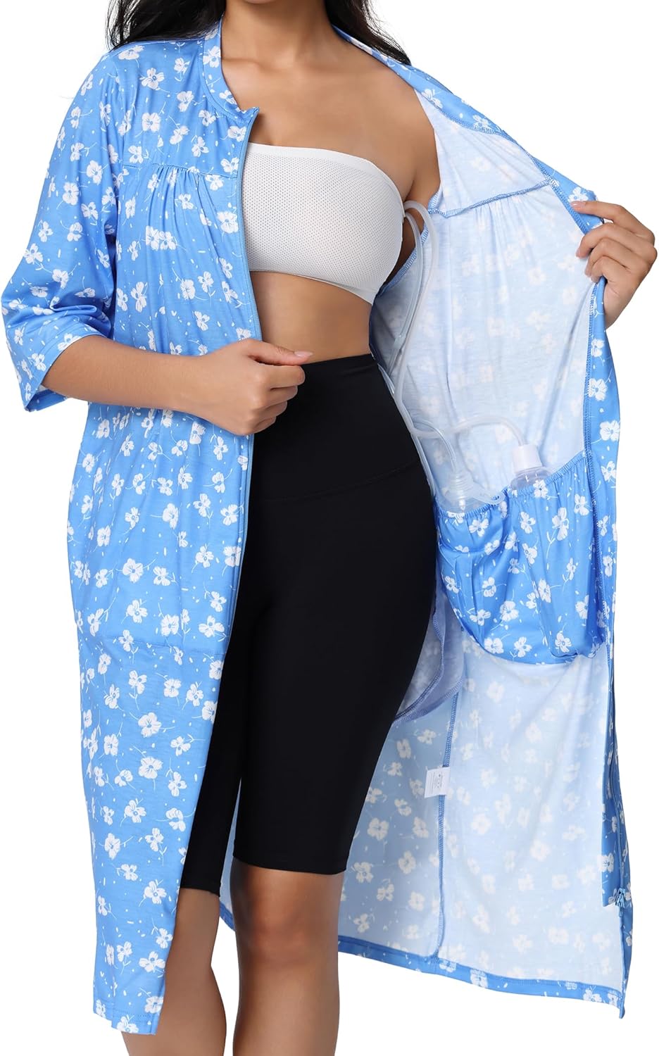 Women’s Post Surgery Robe & Hospital Gown with Zipper, Drain & Side Pockets, Mastectomy Recovery Pajamas & Gift