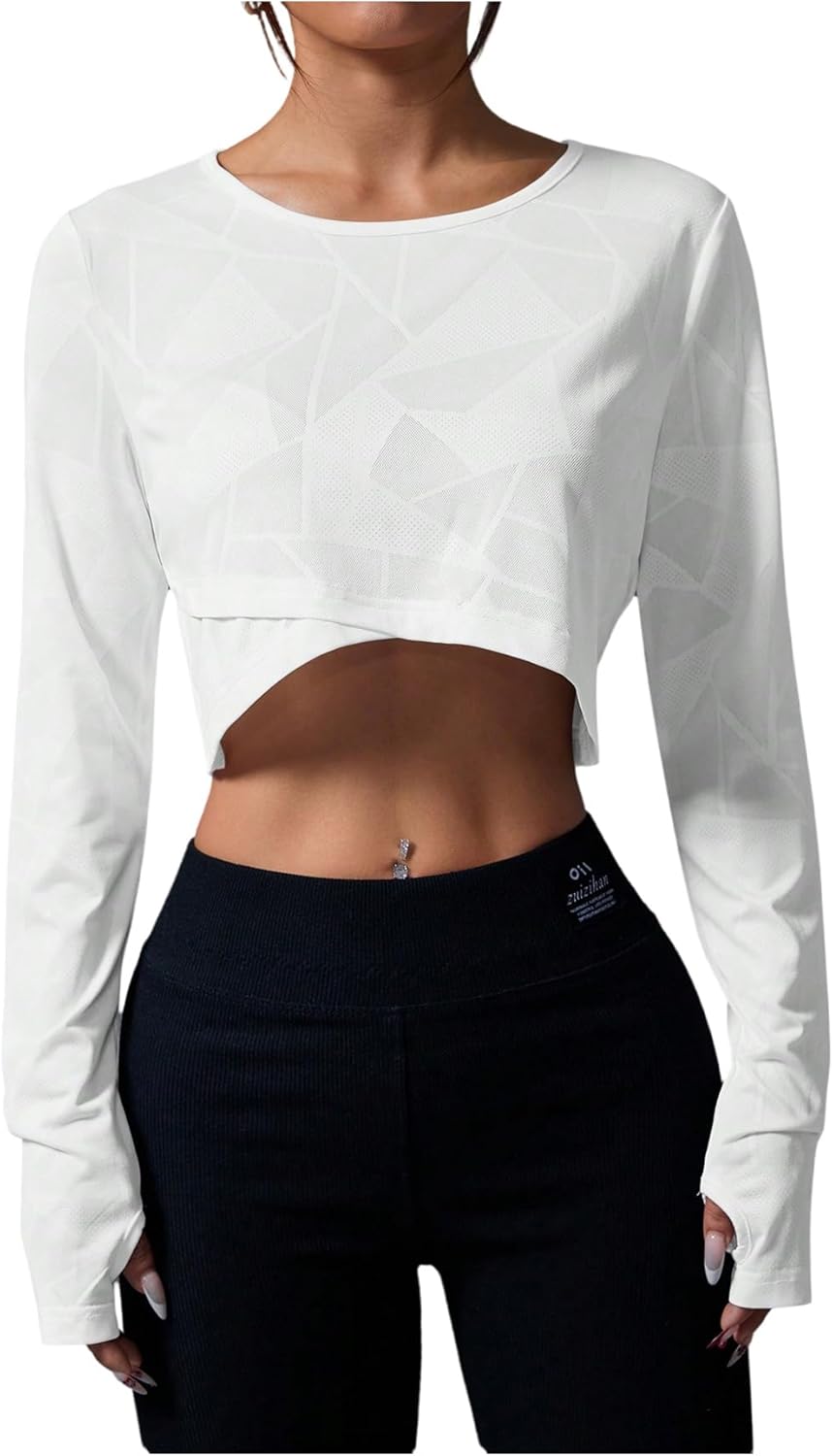 OYOANGLE Women's Long Sleeve Geo Workout Top Cross Wrap Hem Athletic Shirts Running Gym Yoga Crop Tops