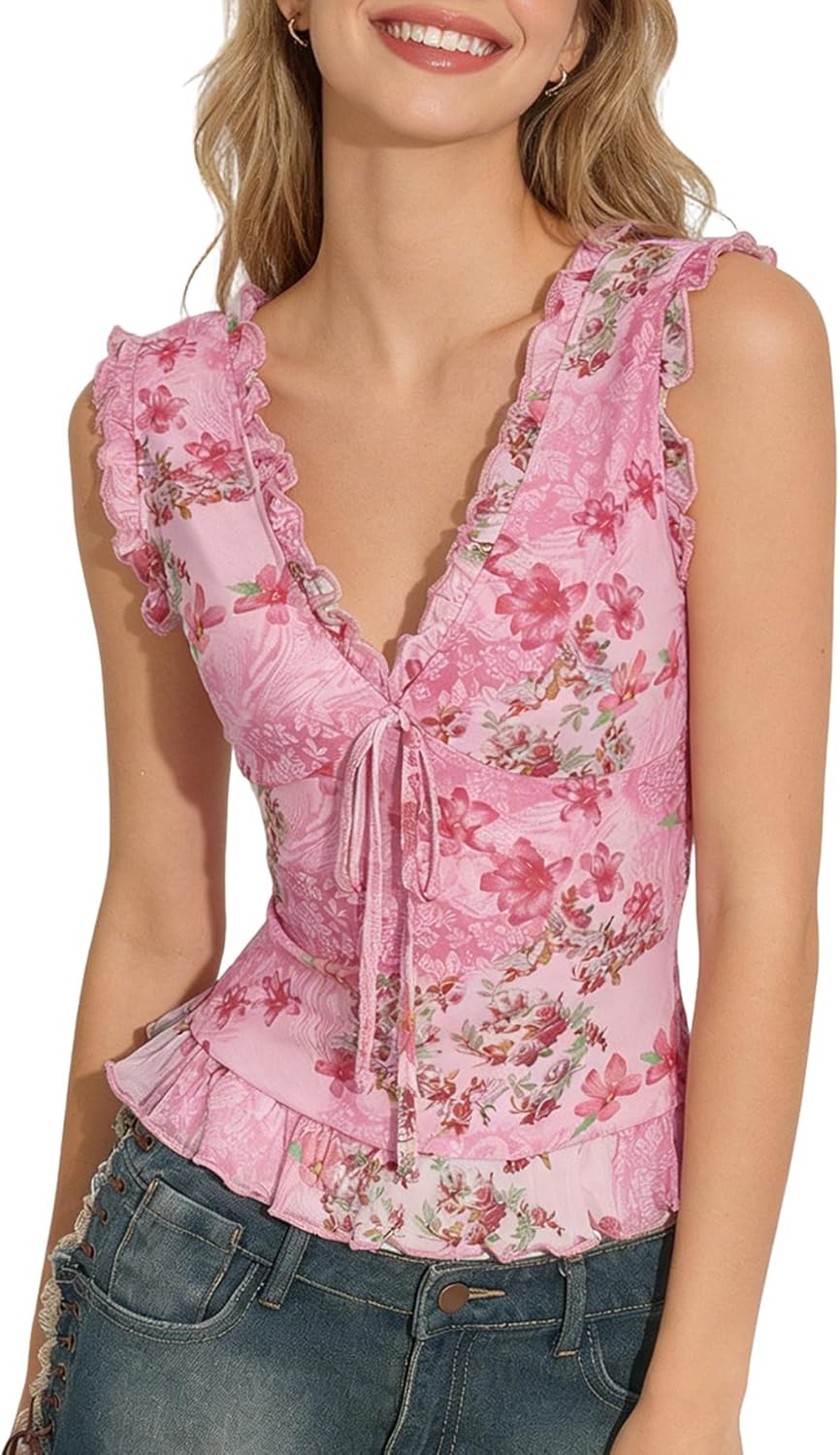 OYOANGLE Women's Floral Print V Neck Mesh Tank Top Frill Trim Sleeveless Summer Going Out Tops