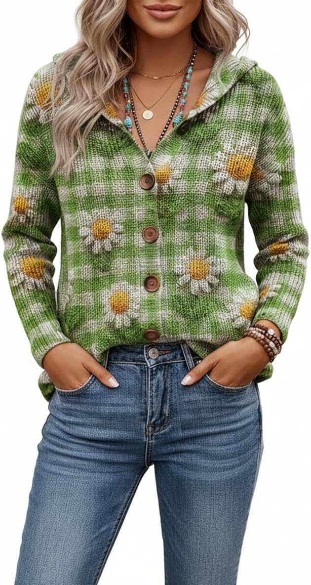 Women's Lightweight Boho Floral Button Down Hooded Knit Cardiagn Hoodies Casual Cute Oversized Long Sleeve Shirt