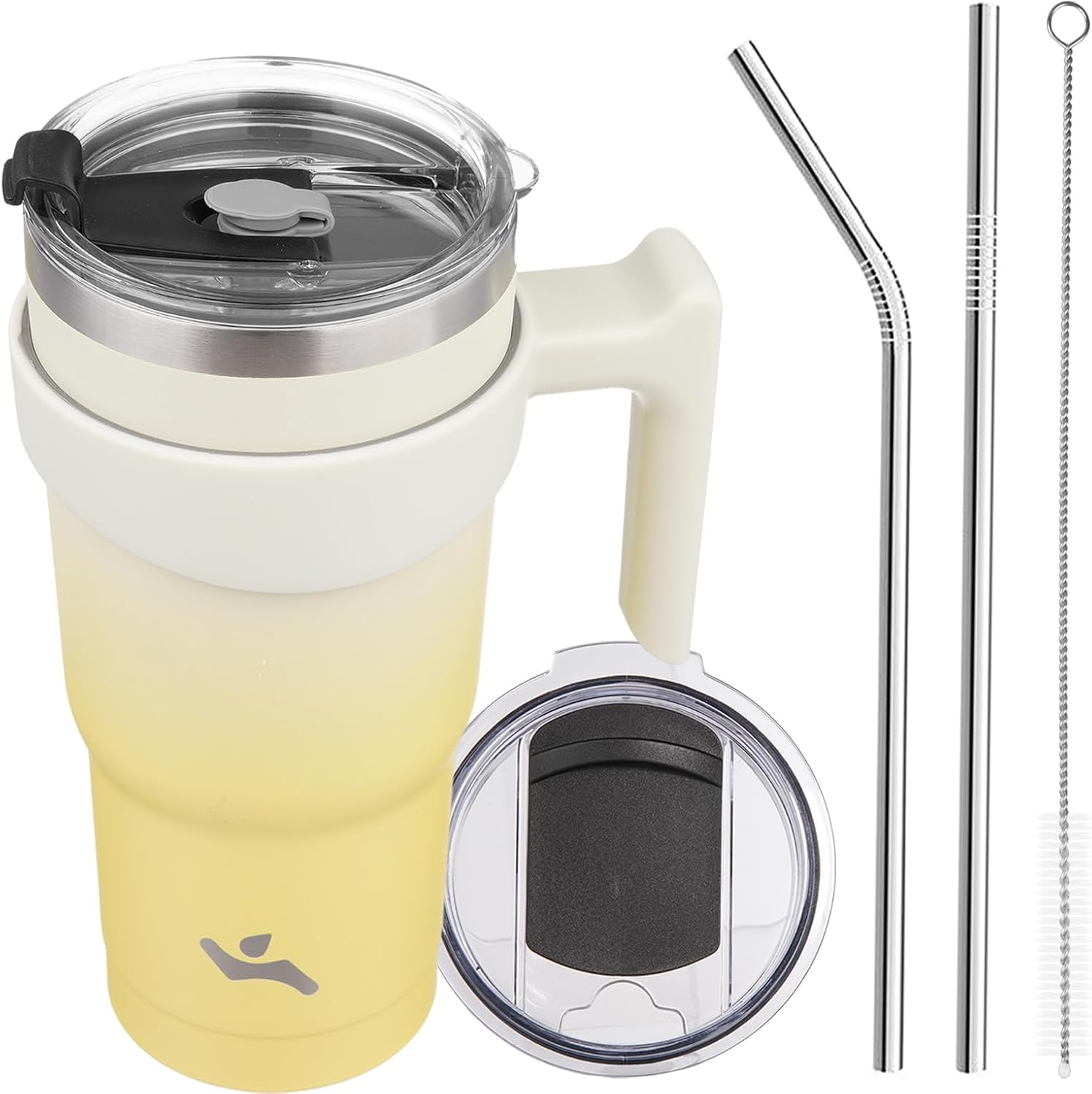 20 oz Tumbler with Handle and 2 Straw 2 Lid, Insulated Water Bottle Stainless Steel Vacuum Cup Reusable Travel Mug,Lemon