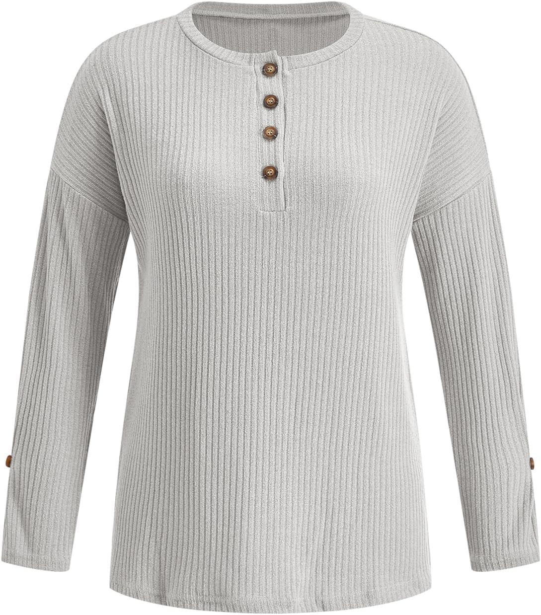 Women's Button Front Long Sleeve Henley Shirts Crew Neck Ribbed Knit Dressy Casual Tops
