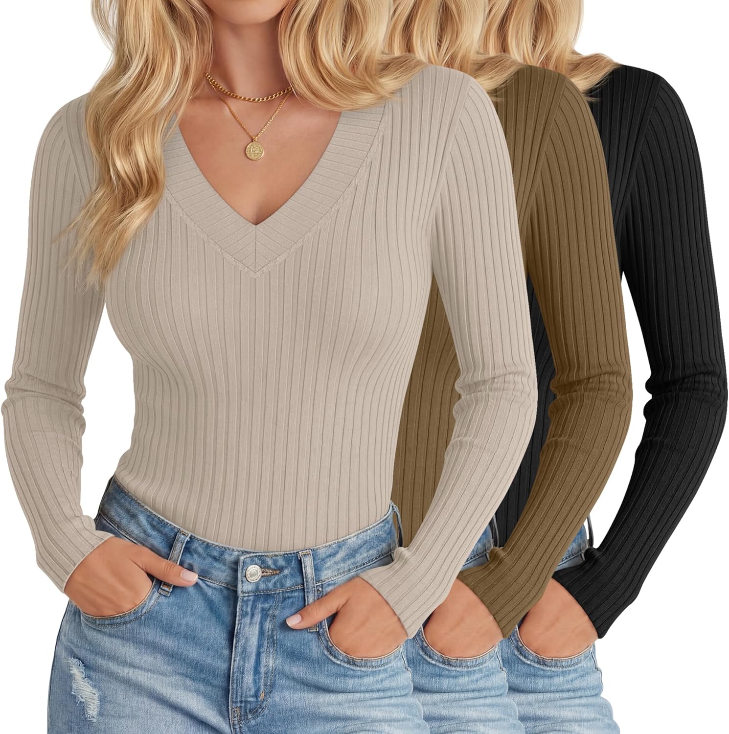3 Pack Women's Ribbed Deep V Neck Shirts Long Sleeve Knit Slim Fit Casual Base Layer Soft Undershirts Blouses Tops