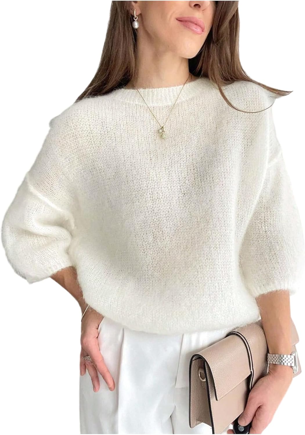 SHENHE Women's Solid Color Crewneck Off Shoulder 3/4 Sleeve Mohair Lightweight Pullover Sweater