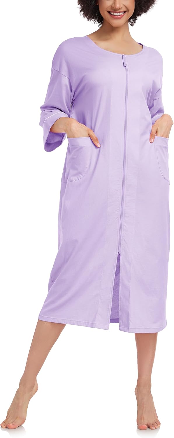 COLORFULLEAF 100% Cotton Zipper Robes for Women 3/4 Sleeve Bathrobe Lightweight with Pockets Loungewear