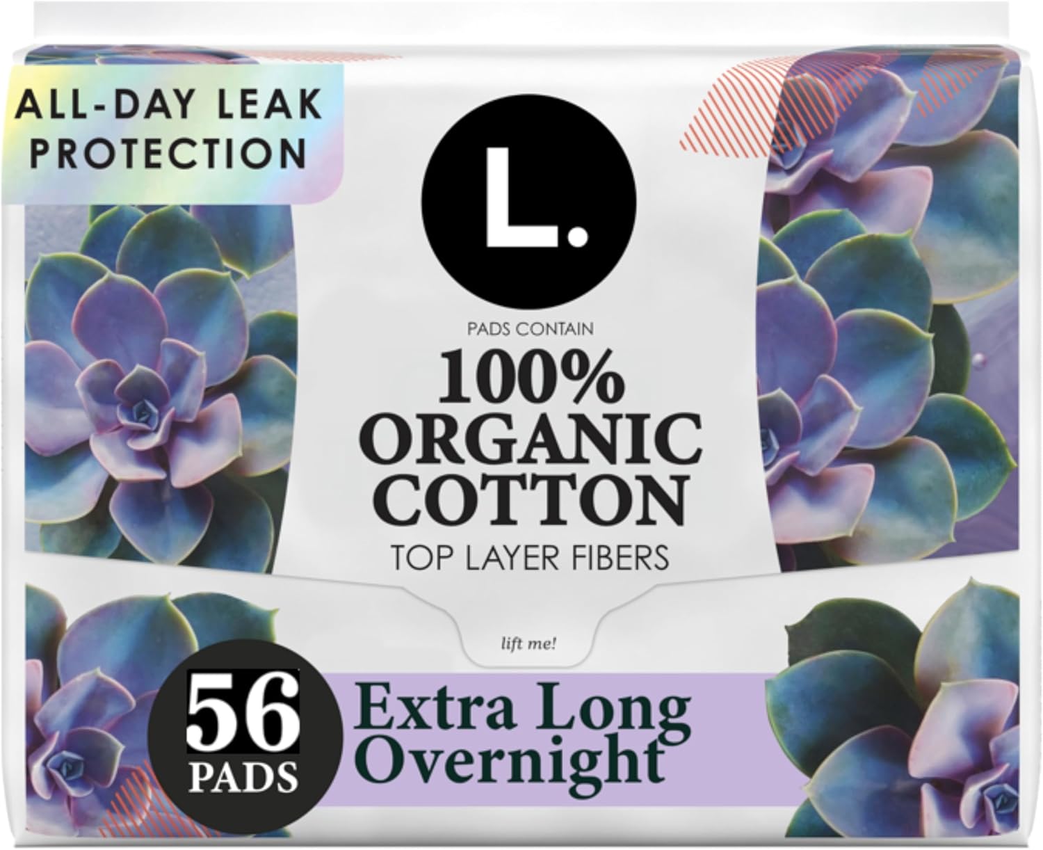 L. Extra Long Maxi Pads for Women, Overnight Absorbency, Organic Cotton Top Layer, Unscented Pads with Wings, 56 Count (2 Packs of 28)