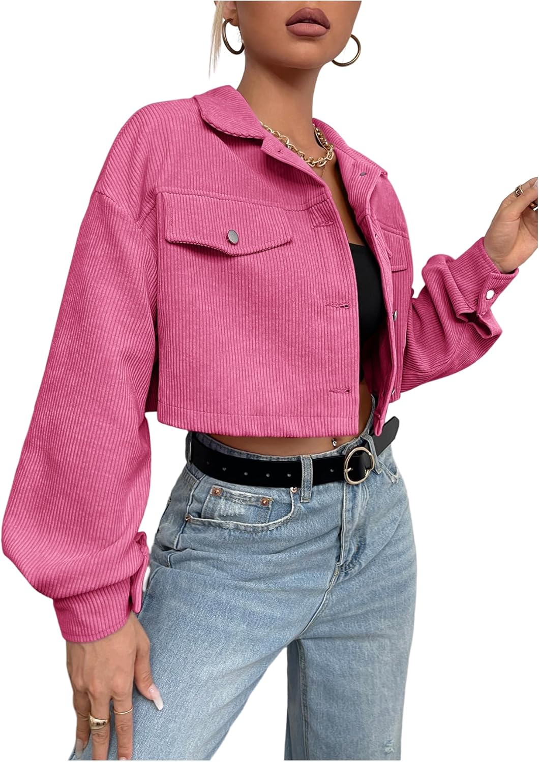 SHENHE Women's Corduroy Jacket Button Down Cropped Shacket Long Sleeve Fall Jacket Outwear