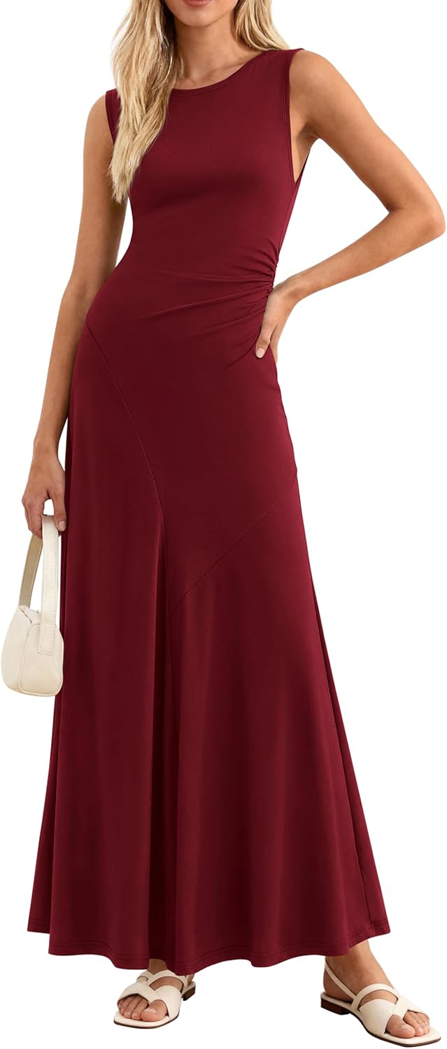 MASCOMODA Summer Casual Sleeveless Maxi Dresses for Women 2026 Spring Ruched A Line Flowy Tank Beach Vacation Long Sundress