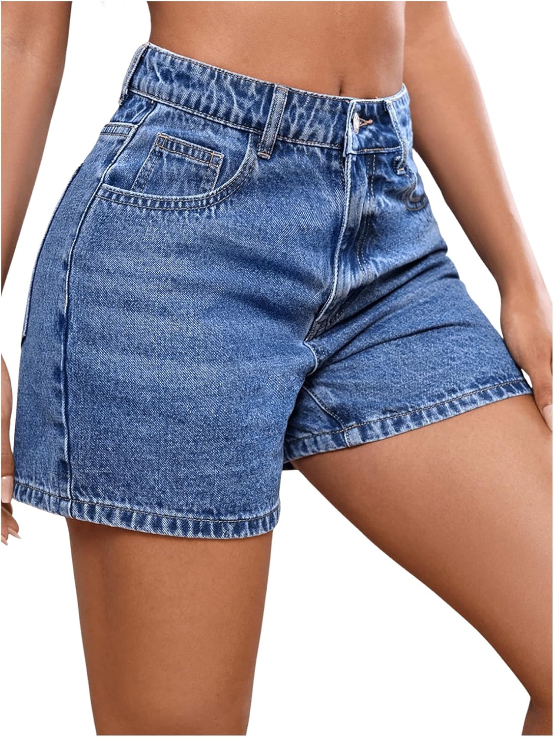 WDIRARA Women's Petite High Waisted Denim Shorts Straight Leg Jean Shorts with Pockets