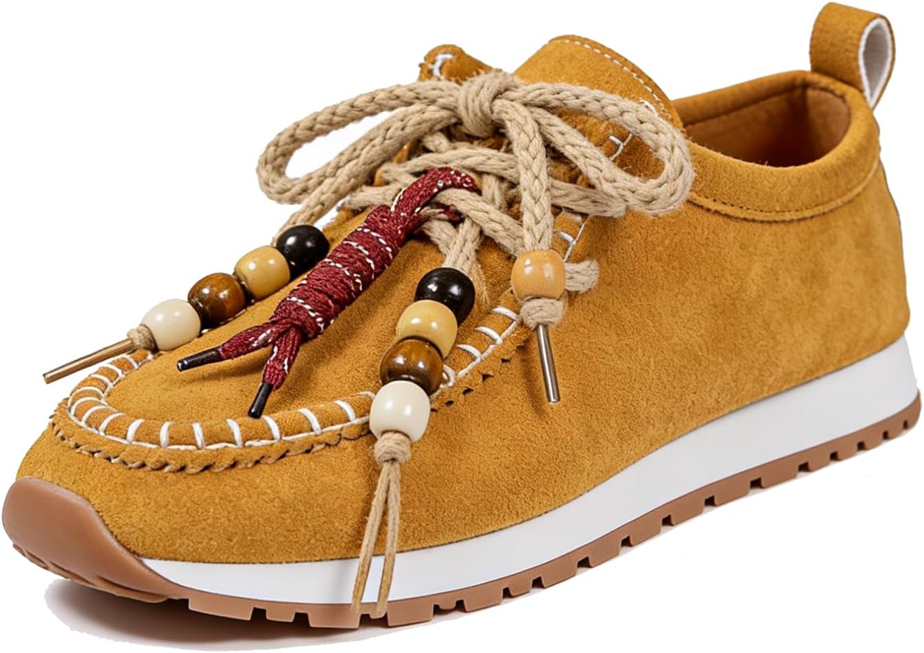 Women's Suede Platform Loafers with Beaded Retro Comfortable Round Toe Slip On Orthopedic Walking Shoes for Daily Work Driving Casual Shoes