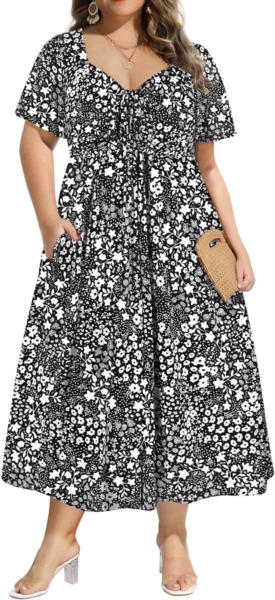 CARCOS Plus Size Dresses for Curvy Women Tie Sweetheart Neck Summer Maxi Dress Short Sleeve Empire Waist Floral Boho Dress