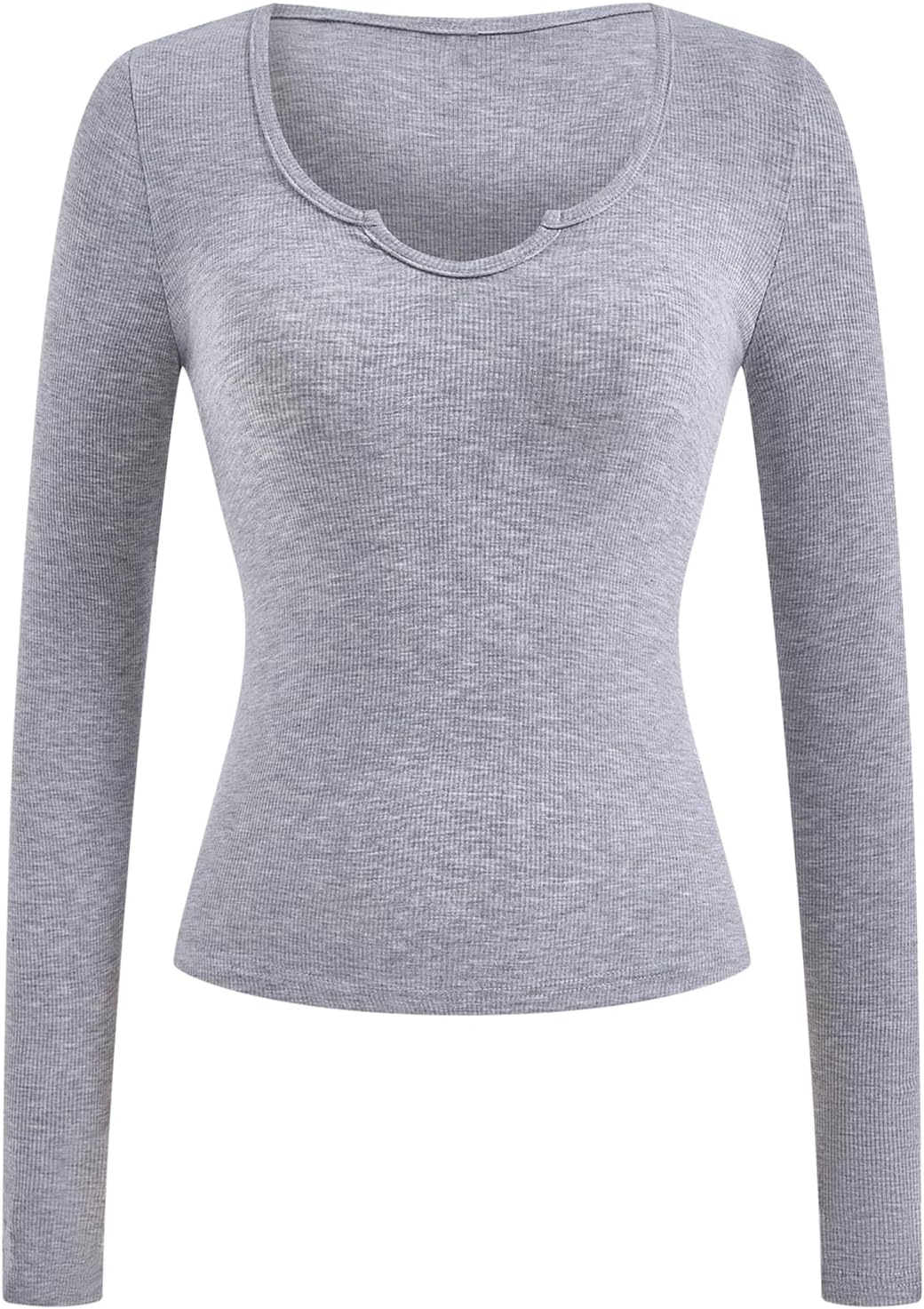 Women's Notch Neck Long Sleeve T Shirt Basic Ribbed Knit Dressy Casual Tops