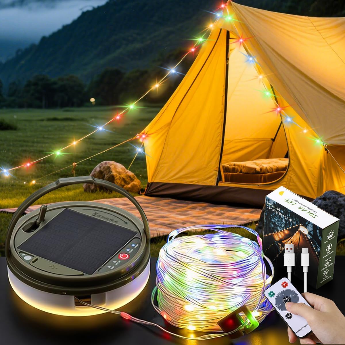 - 8 Versatile Lighting Modes: Experience dynamic illumination with our Solar Camping String Lights offering 4+4 specialized modes: cozy warm white for ambient lighting, dazzling RGB alternating flash and breathing effects for parties, combined camping lantern+string light function, powerful task lighting, and XTE strong/medium/weak/SOS flashing modes for emergencies. Perfect for transforming campsites, gardens, patios and festive celebrations.
