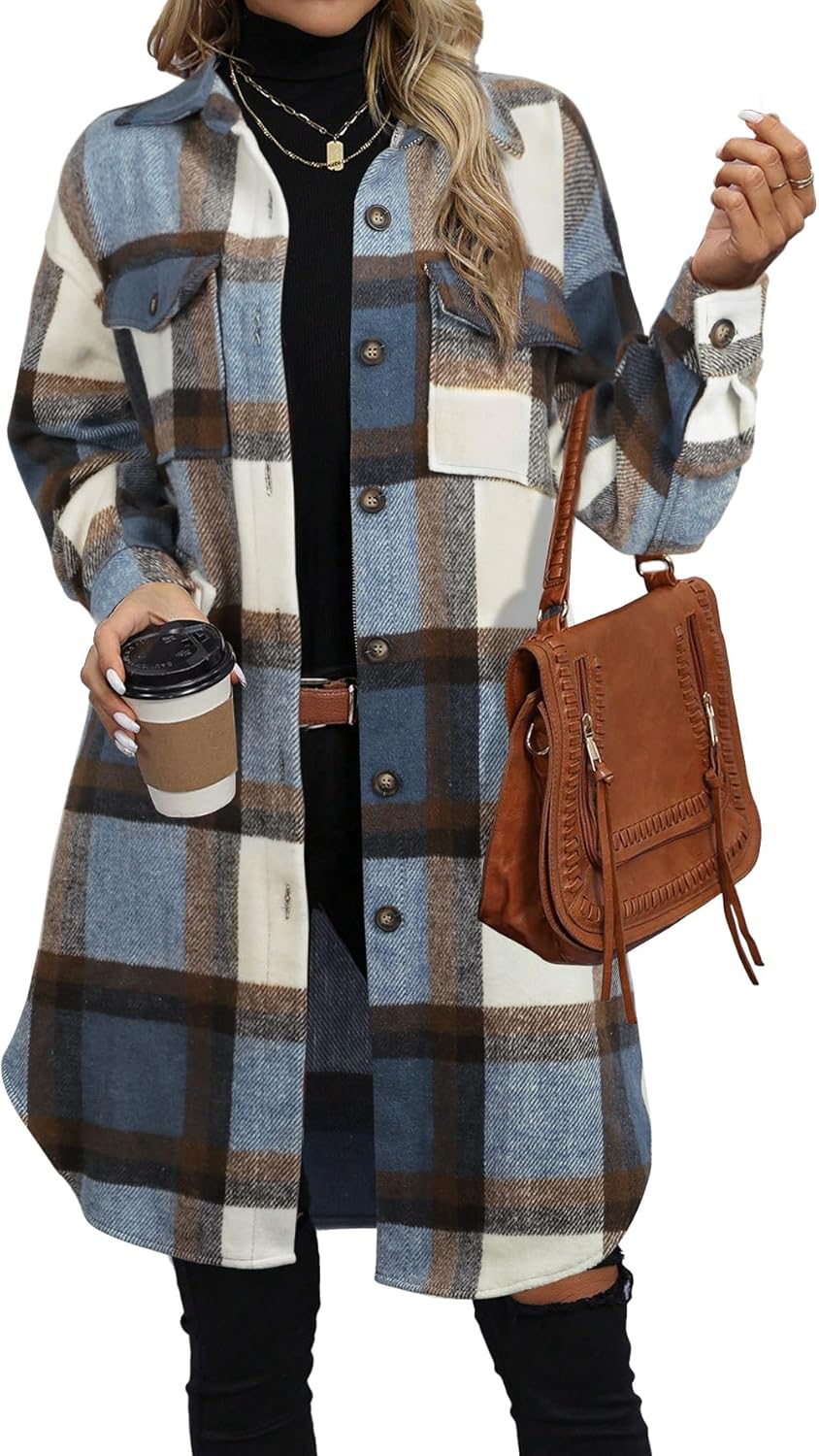 NIeyook Plaid Shacket Jacket Women Button Down Long Flannel Shirt Fall Oversized Jackets Casual Shaket Lapel Winter Coats