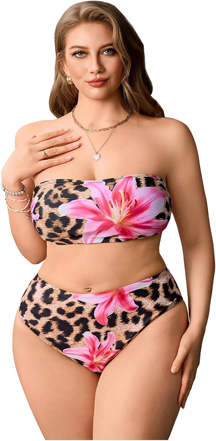 Women's Plus Size Floral Leopard Bandeau Swimsuits High Waisted Bikini Set 2 Piece Bathing Suits