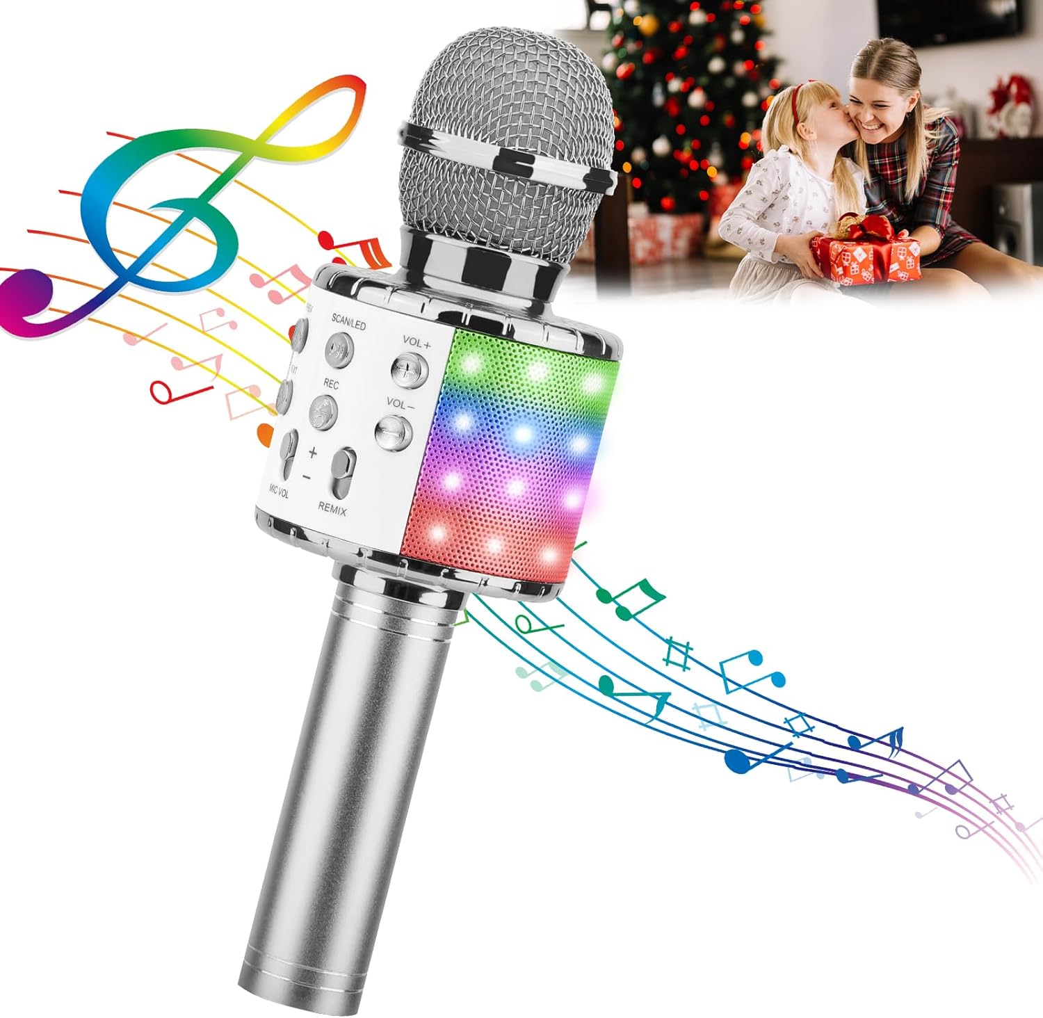 ShinePick Karaoke Microphone, 4 in 1 Wireless Microphone with LED Lights Handheld Portable Karaoke Machine, Home KTV Player, Compatible with Android & iOS Devices (Silver)