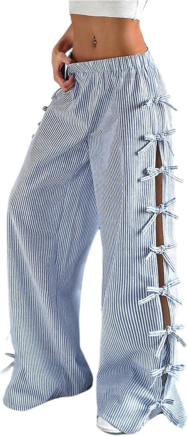 Verdusa Wide Leg Linen Pants for Women Striped Bow Baggy Hiking Pants Long Trousers