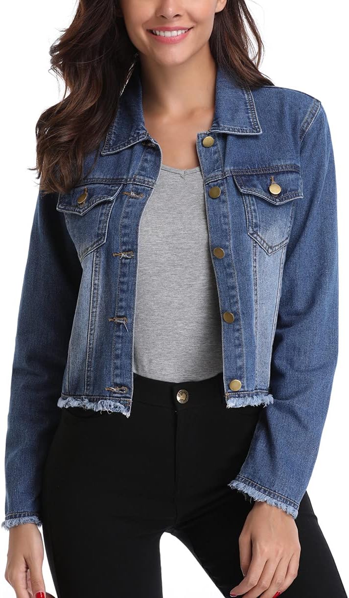 Anienaya Jean Jacket Women’s Frayed Washed Button Up Cropped Denim Jacket w 2 Side Pockets