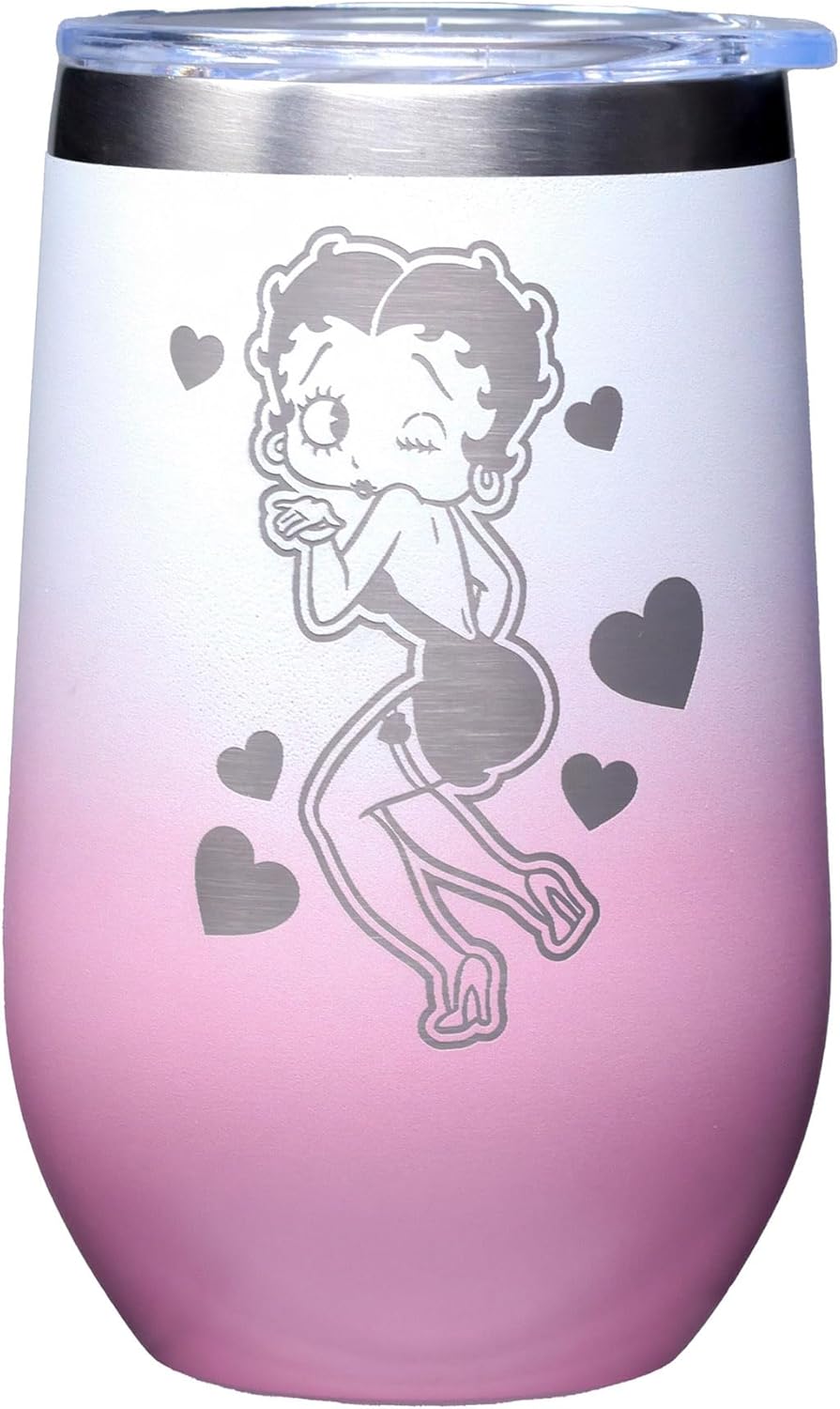 Spoontiques Betty Boop Etched Stainless Steel Tumble - Insulated Wine Tumbler with Lid – Double Wall Stainless Steel Stemless Wine Glass – 16oz - 5 5/8" Tall