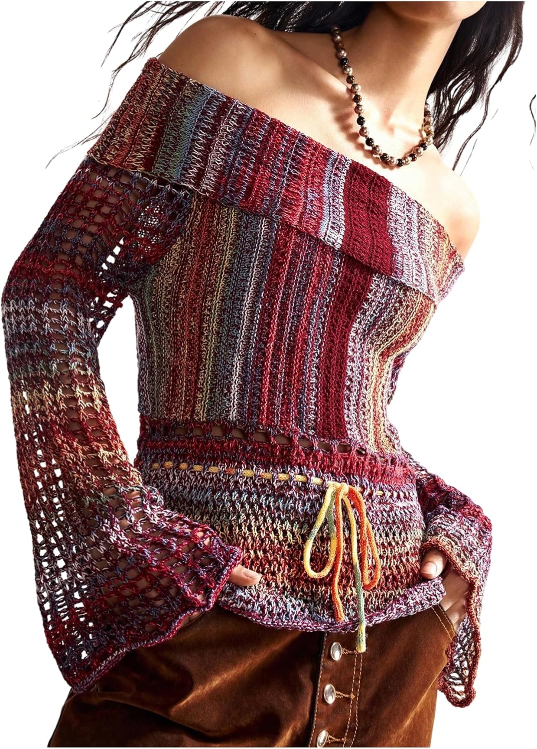 WDIRARA Women's Crochet Off The Shoulder Sweater Striped Hollow Out Long Bell Sleeve Pullover Knit Tops