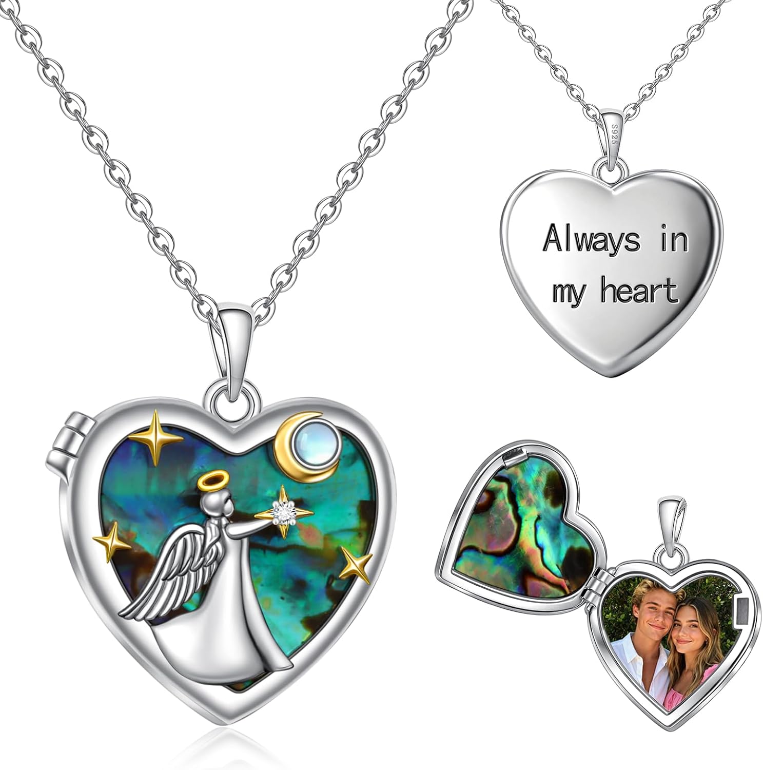 Fenthring Angel Heart Locket Necklace that Holds Pictures Photo 925 Sterling Silver Abalone Pendant Engraved Always in My Heart 20"